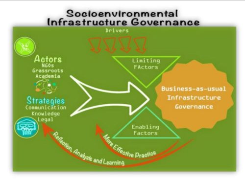 The report begins with a very brief overview of the GIA project and the “business as usual” conceptual framework that shows how infrastructure proponents control infrastructure planning and implementation without adequate participation and governance by social and environmental interests that are directly impacted. We then present our theory of change for socioenvironmental governance of infrastructure, based on effective collaboration between grassroots organizations, NGOs and academia on strategies for knowledge production and communication to influence legal and political decision-making. Access report here