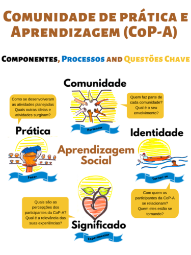 Para entender como os processos de aprendizagem social ocorrem entre os membros da CoP-A do GIA, a equipe do GIA amplamente adotou e adaptou os conceitos de "Teoria Social da Aprendizagem" e "Comunidades de Prática" propostos por Etienne Wenger e colegas*. Entendemos que os dois conceitos estão interligados e abrangem mudanças no entendimento e comportamento entre os membros de uma ampla comunidade, que compartilham pontos em comum em suas práticas e descobrem significado em suas interações e atividades de aprendizagem, criando uma identidade comum. Nesse sentido, os quatro componentes principais da nossa abordagem são: comunidade, prática, significado e identidade, que possuem quatro processos correspondentes: pertencer, fazer, experimentar e tornar, conforme disposto na figura acima, juntamente com questões-chave para ser abordado no contexto do GIA para cada componente.
